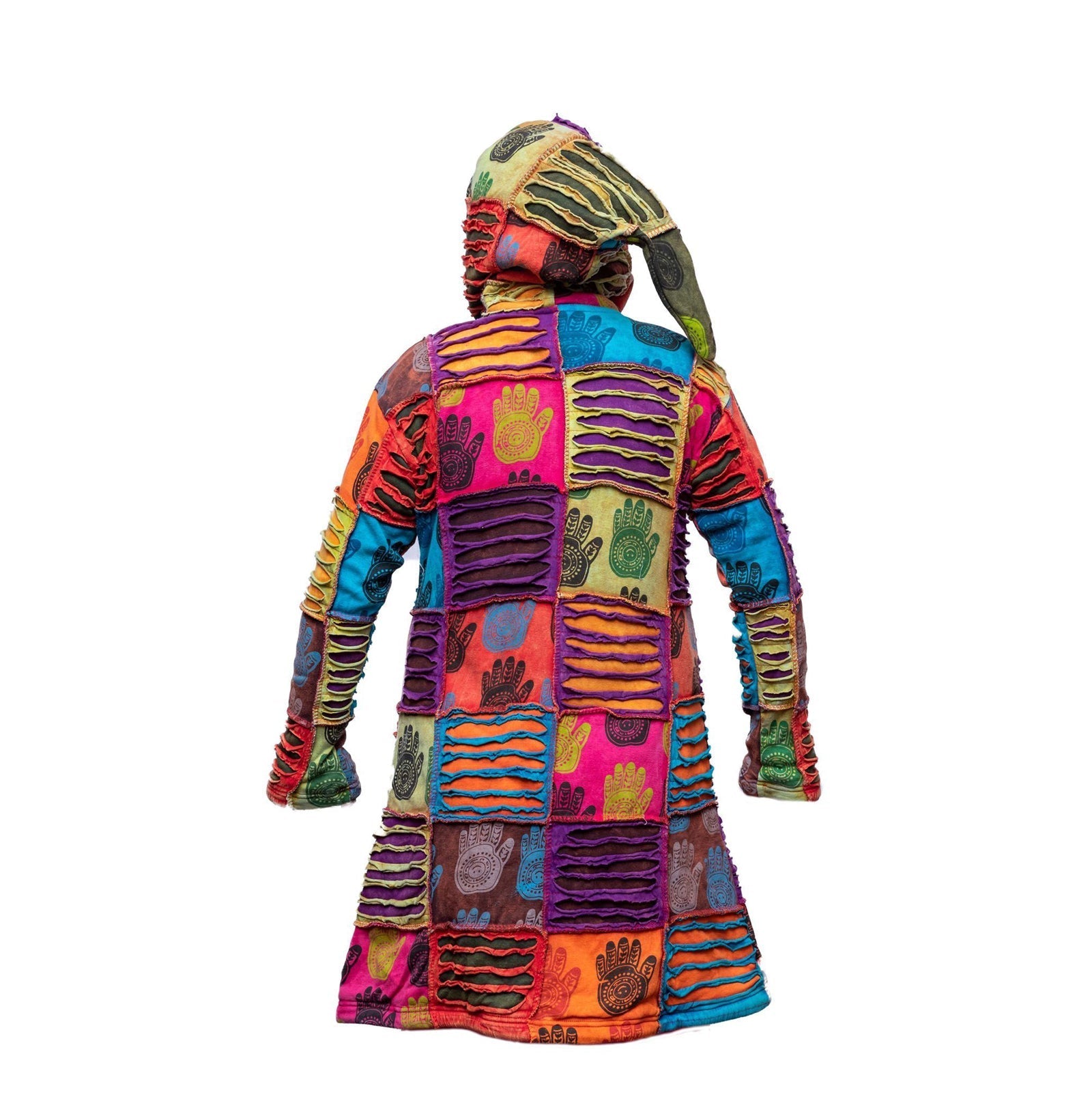 This pixie hooded jacket features a Henna Hands print and is zip up front with two side pockets, it features patches of traditional henna hand print symbols and razor cut slashes. All the embroidery details and prints are hand done so each jacket produced is unique. The colour and size may be slightly different as these items are handmade individually so please do not mistake it as defect.