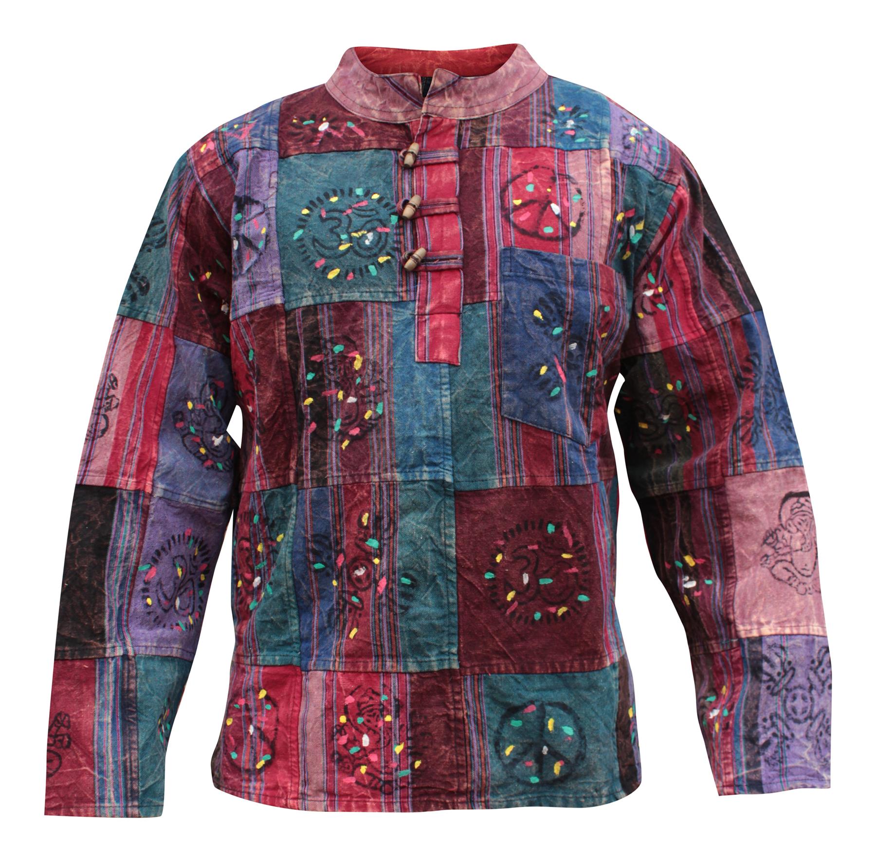 These grandad shirts are made of stonewashed cotton and feature multi-color striped patches with traditional symbol detail, they are an awesome choice for the hot climate. They are designed for casual and loungewear. Three buttons at the top with grandad collar, these shirts are long-sleeved but are very lightweight and suitable for summer. The eye-catching bright color and symbols give it a unique style. These shirts have a chest pocket on the upper left side.
