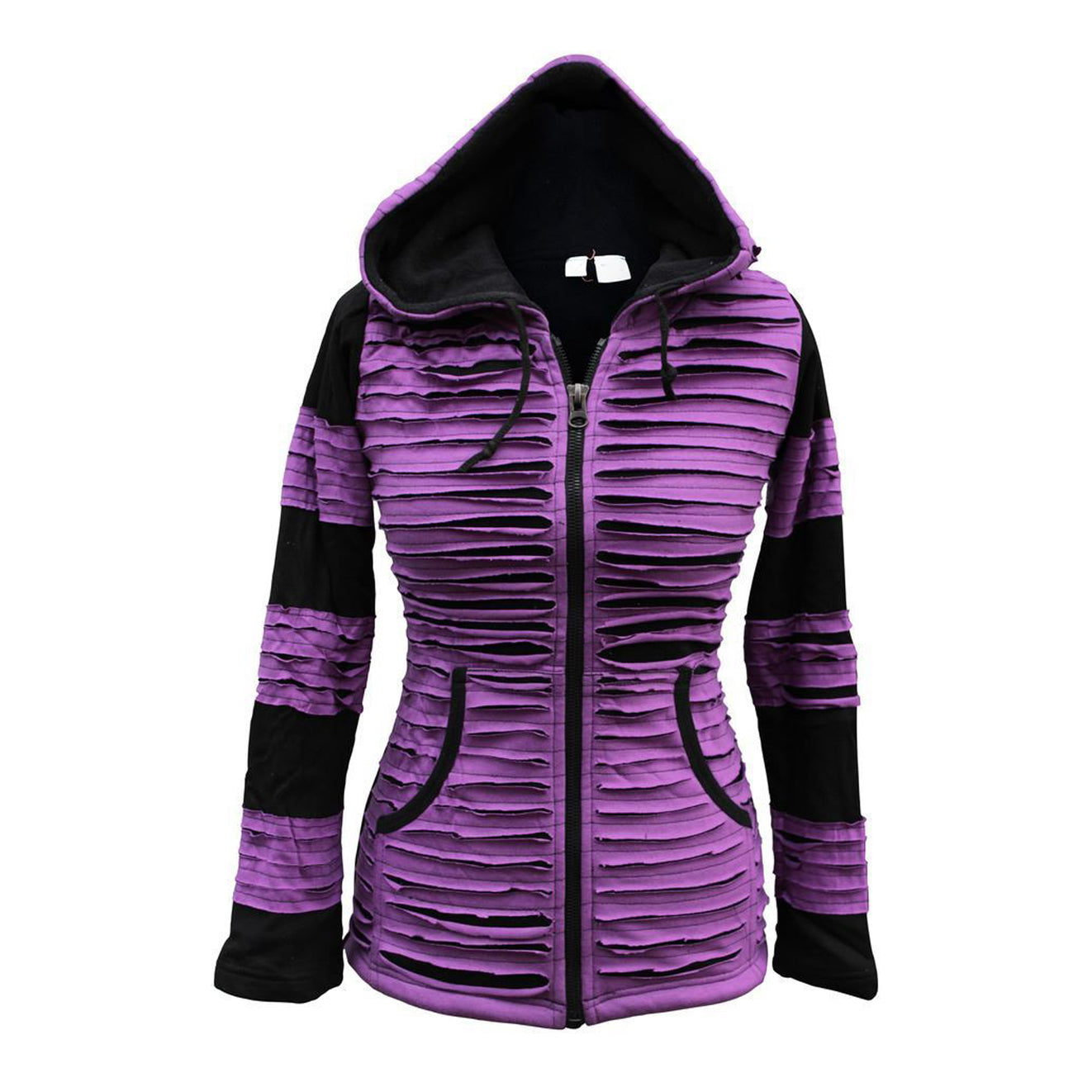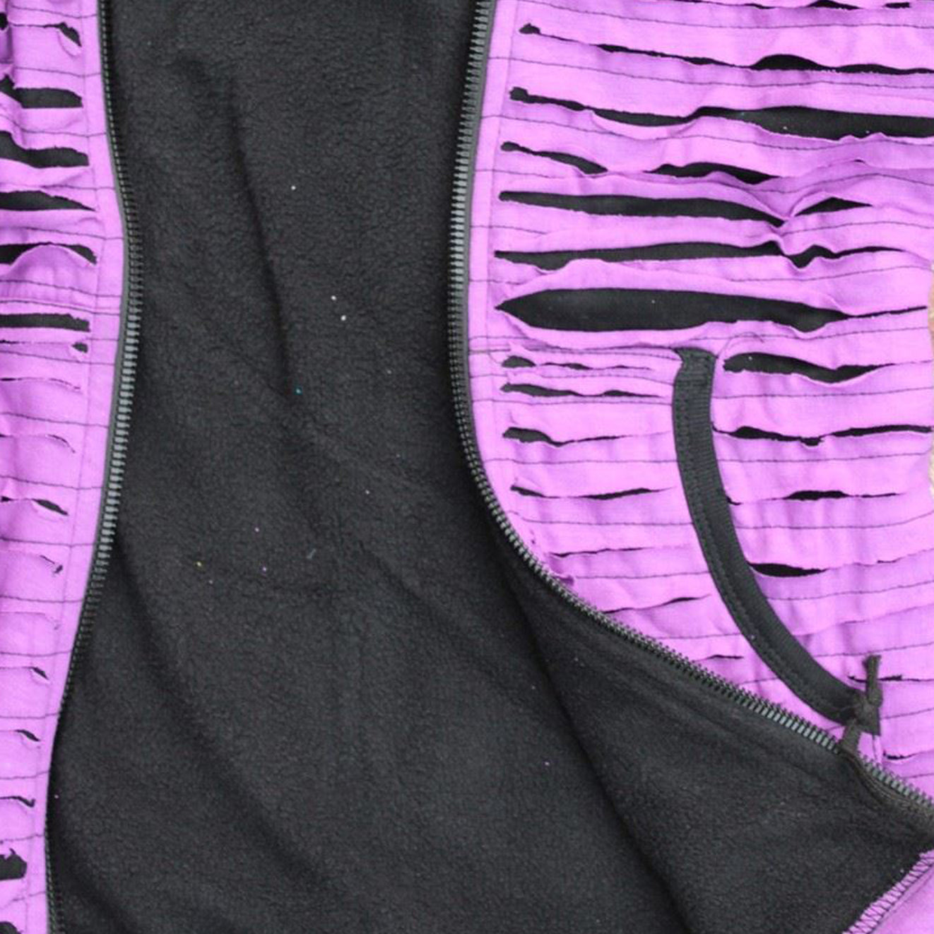 Our lightweight, comfortable and 100% cotton & fleece jackets are the perfect addition to your wardrobe. These jackets feature purple and black stripes with patches of razor cut detail. This pixie hooded jacket is hip length and zips up with two side pockets. This winter jacket is made with stonewashed, soft stretchy rib cotton fabric that makes you warmer in cold weather. They feature a full front zip with long pointed hood, drawstring at waist and hem and they have two deep front pockets. They are hand made and every details are provided with special care. These jackets may be exactly what you are looking for this winter. Every detail is provided with special attention so the resultant product speaks of absolute finery. All the embroidery details and prints are hand done so each jacket produced is unique.